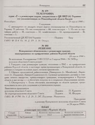 Приложение к решению Кемеровского исполкома областного Совета от 24 апреля 1944 г. План реэвакуации населения в Курскую область // ГАКО. Ф. Р-790. Оп. 1. Д. 26. Л. 248. Подлинник. Машинопись.
