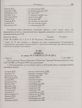 Приказ по заводу № 77 НКТП СССР № 223/к. г. Барнаул. 5 мая 1944 г. // ГААК. Ф. Р-1038. Оп. 1. Д. 6. Л. 54, 54об. Подлинник. Машинопись.