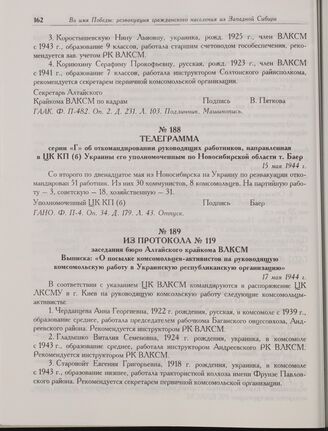 Из протокола № 119 заседания бюро Алтайского крайкома ВЛКСМ. Выписка: «О посылке комсомольцев-активистов на руководящую и комсомольскую работу в Украинскую республиканскую организацию. 17 мая 1944 г.