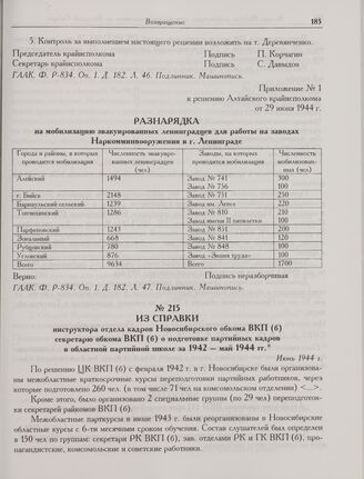 Приложение № 1 к решению Алтайского крайисполкома от 29 июня 1944 г. Разнарядка на мобилизацию эвакуированных ленинградцев для работы на заводах Наркомминвооружения в г. Ленинграде // ГААК. Ф. P-834. Оп. 1. Д. 182. Л. 47. Подлинник. Машинопись.