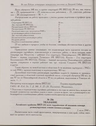 Указание Алтайского крайкома ВКП(б) всем горрайкомам об оказании помощи реэвакуируемым семьям военнослужащих. 1 июля 1944 г.