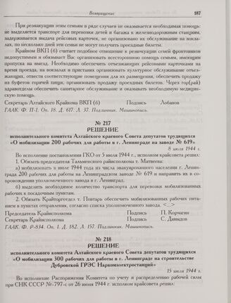 Решение исполнительного комитета Алтайского краевого Совета депутатов трудящихся «О мобилизации 200 рабочих для работы в г. Ленинграде на заводе № 619». 8 июля 1944 г. // ГААК. Ф. P-834. Оп. 1. Д. 182. Л. 157. Подлинник. Машинопись.