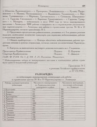 Приложение № 1 к решению Алтайского крайисполкома от 17.VII.1944 г. Разнарядка на мобилизацию эвакуированных ленинградцев для работы в строительных трестах № 16 и 53 Наркомсудпрома в г. Ленинграде // ГААК. Ф. Р-834. Оп. 1. Д. 184. Л. 26. Подлинник. Машинопись.