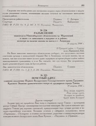 Разъяснение эвакоотдела Новосибирского облисполкома гр. Марышевой в связи с ее заявлением о задержке ее в районе, несмотря на наличие вызова на выезд в г. Ленинград. 18 августа 1944 г.