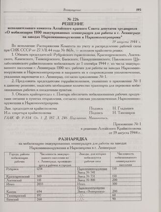 Приложение № 1 к решению Алтайского Крайисполкома от 19 августа 1944 г. Разнарядка на мобилизацию эвакуированных ленинградцев для работы на заводах Наркомминвооружения и Наркомпрома в г. Ленинграде // ГААК. Ф. Р-834. Оп. 1. Д. 187. Л. 247. Подлинник. Машинопись.