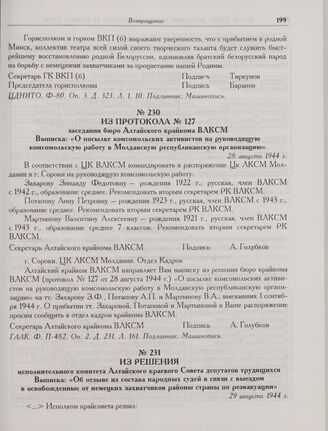Из решения исполнительного комитета Алтайского краевого Совета депутатов трудящихся. Выписка: «Об отзыве из состава народных судей, в связи с выездом в освобожденные от немецких захватчиков районы страны по реэвакуации». 29 августа 1944 г. // ГААК. Ф. Р-834. Оп. 1. Д. 188. Л. 211. Подлинник. Машинопись.