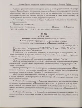 Решение исполнительного комитета Кемеровского областного Совета депутатов трудящихся «О реэвакуации граждан, не занятых в промышленности, в Калининскую область». 11 сентября 1944 г.