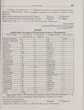 Приложение к решению Кемеровского облисполкома от 11 сентября 1944 г. План реэвакуации населения из Кемеровской области в Калининскую // ГАКО. Ф. P-790. Оп. 1. Д. 31. Л. 119-120. Подлинник. Машинопись.