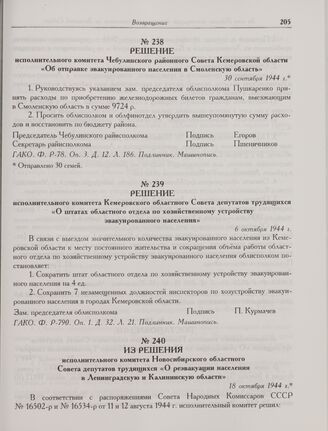 Решение исполнительного комитета Чебулинского районного Совета Кемеровской области «Об отправке эвакуированного населения в Смоленскую область». 30 сентября 1944 г. // ГАКО. Ф. Р-78. Оп. 3. Д. 12. Л. 186. Подлинник. Машинопись.
