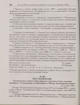 Постановление исполнительного комитета Новосибирского областного Совета депутатов трудящихся «О реэвакуации из Новосибирска в Москву Третьяковской галереи». 23 октября 1944 г.