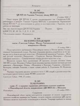 Телеграмма серии «Г» о задержке украинских работников сельского хозяйства в Новосибирской области, направленная в ЦК ВКП(б) т. Шаталину. Новосибирск. 21 ноября 1944 г.