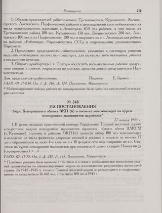 Из постановления бюро Кемеровского обкома ВКП(б) о посылке комсомольцев на курсы помощников машинистов паровозов. 27 января 1945 г. // ГАКО. Ф. П-75. Оп. 1. Д. 217. Л. 135. Подлинник. Машинопись.