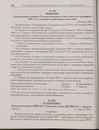 Телеграмма Кемеровского обкома ВКП(б) в Управление кадров ЦК ВКП(б) т. Андрееву. 27 февраля 1945 г.