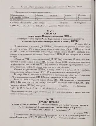 Справка отдела кадров Кемеровского обкома ВКП(б) секретарю обкома партии С.Б. Зодионченко о посылке коммунистов и комсомольцев на оперативную работу и в школу НКГБ. 17 апреля 1945 г.