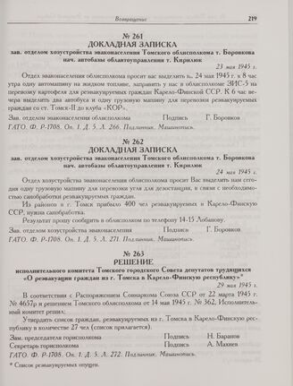 Докладная записка зав. отделом хозустройства эваконаселения Томского облисполкома т. Боровкова нач. автобазы облавтоуправления т. Кирилюк. 23 мая 1945 г. // ГАТО. Ф. Р-1708. Оп. 1. Д. 5. Л. 266. Подлинник. Машинопись.