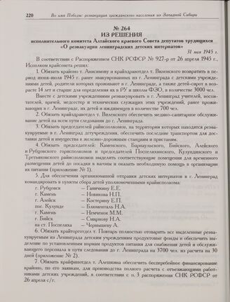 Из решения исполнительного комитета Алтайского краевого Совета депутатов трудящихся «О реэвакуации ленинградских детских интернатов». 31 мая 1945 г.