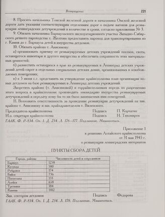 Приложение 1 к решению Алтайского крайисполкома от 31 мая 1945 г. о реэвакуации ленинградских интернатов. Пункты сбора детей // ГААК. Ф. P-834. Оп. 1. Д. 234. Л. 178. Подлинник. Машинопись.