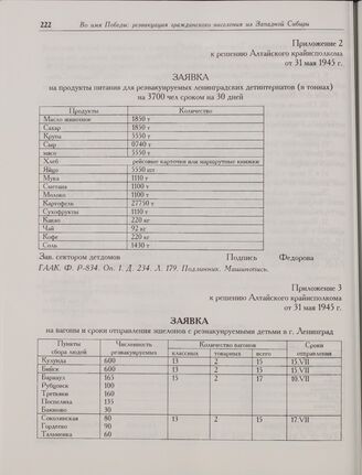 Приложение 2 к решению Алтайского крайисполкома от 31 мая 1945 г. о реэвакуации ленинградских интернатов. Заявка на продукты питания для реэвакуируемых ленинградских детинтернатов (в тоннах) на 3700 чел сроком на 30 дней