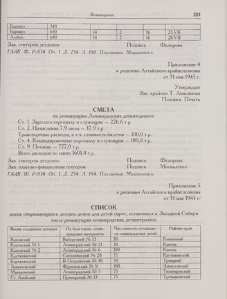 Приложение 4 к решению Алтайского крайисполкома от 31 мая 1945 г. о реэвакуации ленинградских интернатов. Смета на реэвакуацию Ленинградских детинтернатов // ГААК. Ф. P-834. Оп. 1. Д. 234. Л. 184. Подлинник. Машинопись.