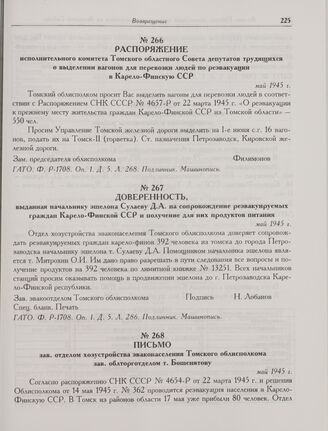 Распоряжение исполнительного комитета Томского областного Совета депутатов трудящихся о выделении вагонов для перевозки людей по реэвакуации в Карело-Финскую ССР. Май 1945 г. // ГАТО. Ф. Р-1708. Оп. 1. Д. 5. Л. 268. Подлинник. Машинопись.