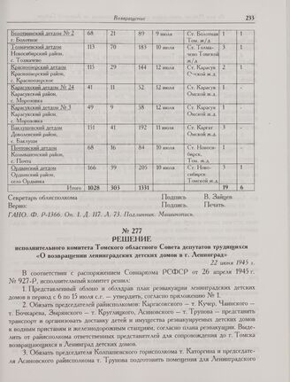 Решение исполнительного комитета Томского областного Совета депутатов трудящихся «О возвращении ленинградских детских домов в г. Ленинград». 22 июня 1945 г. // ГАТО. Ф. P-829. Оп. 3. Д. 12. Л. 12-14. Подлинник. Машинопись.
