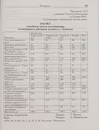 Приложение № 2 к решению Томского облисполкома от 22 июня 1945 г. «О реэвакуации ленинградских детских домов». Расчет потребности средств для реэвакуации воспитанников и работников детдомов в г. Ленинград