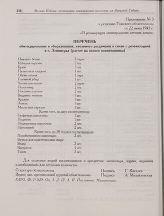 Приложение № 3 к решению Томского облисполкома от 22 июня 1945 г. «О реэвакуации ленинградских детских домов». Перечень обмундирования и оборудования, увозимого детдомами в связи с реэвакуацией в г. Ленинград (расчет на одного воспитанника) // ГАТО. Ф. Р-829. Оп. 3. Д. 12. Л. 17. Подлинник. Машинопись.