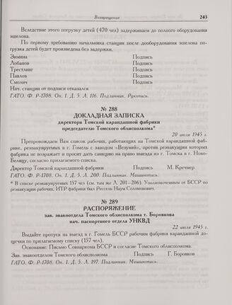 Распоряжение зав. эвакоотдела Томского облисполкома т. Боровкова нач. паспортного отдела УНКВД. 22 июля 1945 г. // ГАТО. Ф. Р-1708. Оп. 1. Д. 5. Л. 197. Подлинник. Машинопись.