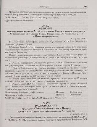 Решение исполнительного комитета Алтайского краевого Совета депутатов трудящихся «О реэвакуации из с. Локоть Вышне-Волоцкой школы глухонемых детей в Калининскую область». 3 августа 1945 г. // ГААК. Ф. P-834. Оп. 1. Д. 239. Л. 24. Подлинник. Машинопись.