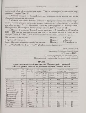 Приложение № 1 к решению Томского облисполкома от 31 августа 1945 г. О реэвакуации граждан Ленинградской, Новгородской, Псковской и Великолукской областей. План реэвакуации граждан Ленинградской, Новгородской, Псковской и Великолукской областей из районов и городов Томской области // ГАТО. Ф. Р-1708. Оп. 1. Д. 5. Л. 30. Подлинник. Машинопись.