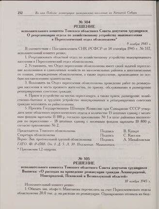 Решение исполнительного комитета Томского областного Совета депутатов трудящихся О реорганизации отдела по хозяйственному устройству эваконаселения в Переселенческий отдел облисполкома. 9 ноября 1945 г. // ГАТО. Ф. Р-1708. Оп. 1. Д. 5. Л. 39. Подлинник.