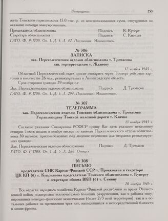 Телеграмма зав. Переселенческим отделом Томского облисполкома т. Тремасова Управляющему Томской железной дороги т. Клячко. 13 ноября 1945 г. // ГАТО. Ф. P-1708. Оп. 1. Д. 5. Л. 288. Отпуск.