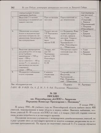 Письмо зав. Новосибирским облОНО т. Андросова Народному Комиссару Просвещения т. Потемкину. 31 января 1946 г. // ГАНО. Ф. Р-1366. Оп. 1. Д. 156. Л. 6. Подлинник. Машинопись.
