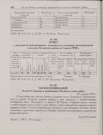 Отчет о численности эвакуированных, оставшихся на постоянное местожительство в колхозах Беловского района на 1 апреля 1948 г. // ГАКО. Ф. P-63. Оп. 2. Д. 205. Л. 20. Подлинник. Машинопись.