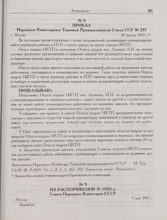 Приказ Народного Комиссариата Танковой Промышленности Союза ССР № 235. г. Москва. 30 марта 1943 г. // ГААК. Ф. Р-1038. Оп. 1. Д. 3. Л. 182-183. Заверенная копия. Машинопись.
