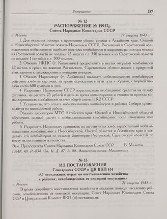 Распоряжение № 15937р Совета Народных Комиссаров СССР. г. Москва. 19 августа 1943 г.