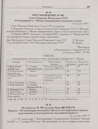 Постановление № 902 Совета Народных Комиссаров СССР «О возвращении в г. Москву эвакуированных московских театров». 24 августа 1943 г. // ГААК. Ф. Р-834. Оп. 11. Д. 45. Л. 13-14. Заверенная копия. Машинопись.