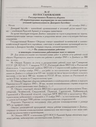 Из постановления Государственного Комитета обороны «О первоочередных мероприятиях по восстановлению угольной промышленности Донецкого бассейна». г. Москва. 26 октября 1943 г. // Директивы КПСС и Советского правительства по хозяйственным вопросам (1917-1957 гг.): Сб. док. Т. 2. М., 1957. С. 802-815.