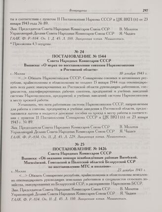 Постановление № 1344 Совета Народных Комиссаров СССР. Выписка: «О мерах по восстановлению совхозов Наркомсовхозов в Ростовской области». г. Москва. 10 декабря 1943 г. // ГААК. Ф. Р.-834. Оп. 11. Д. 45. Л. 229. Заверенная копия. Машинопись.