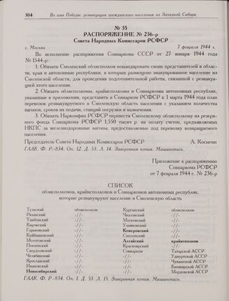 Распоряжение № 236-р Совета Народных Комиссаров РСФСР. г. Москва. 7 февраля 1944 г. // ГААК. Ф. Р.-834. Оп. 12. Д. 53. Л. 14. Заверенная копия. Машинопись.