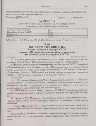 Из постановления № 466 Совета Народных Комиссаров СССР. Выписка: «Об улучшении условий работы детских домов для испанских детей, находящихся в СССР». г. Москва. 25 апреля 1944 г.