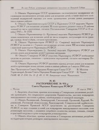 Распоряжение № 931-р Совета Народных Комиссаров РСФСР. г. Москва. 28 апреля 1944 г.