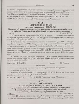 Из протокола № 604 заседания секретариата ЦК ВЛКСМ. Выписка: «О дополнительном отборе руководящих комсомольских работников для работы в Белорусской республиканской комсомольской организации». г. Москва. 3 ноября 1944 г. // ГААК. Ф. П-482. Оп. 2. Д. 214. Л. 54-55. Заверенная копия. Машинопись.