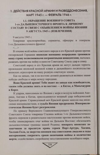 Обращение Военного совета 1-го Дальневосточного фронта к личному составу в связи с объявлением войны Японии. 9 августа 1945 г. (извлечения) // Русский архив: Советско-японская война 1945 г: история военно-политического противоборства двух держав в 30-40-е гг.. Документы и материалы. В 2 т. Т. 18 (7-1). М., 1997. С. 345-346; Великая Отечественная война 1941-1945 гг. В 12 т. Т. 5. Победный финал. Завершающие операции Великой Отечественной войны в Европе. Война с Японией. М., 2013. С. 813-814.