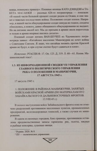 Из информационной сводки VII Управления Главного Политического Управления РККА о положении в Маньчжурии, 17 августа 1945 г. // РГАСПИ. Ф. 17. Оп. 125. Д. 319. Л. 23-34. Копия. Машинописный текст. Родина. 2020. № 8.
