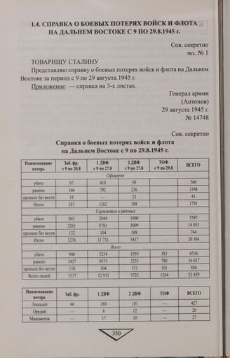 Справка о боевых потерях войск и флота на Дальнем Востоке с 9 по 29.8.1945 г. // АПРФ. Ф. 3. Оп. 66. Д. 1062. Л. 30-33. Из Архива Президента // Родина. 2010. № 9. С. 50-51.