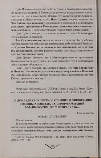 Докладная записка И. Сталину о ликвидации гоминьдановских бандформирований в Маньчжурии, от 26 февраля 1946 г. // АПРФ. Ф. 3. Оп. 66. Д. 1062. Л. 131-132. Из Архива Президента // Родина. 2010. № 9. С. 52.