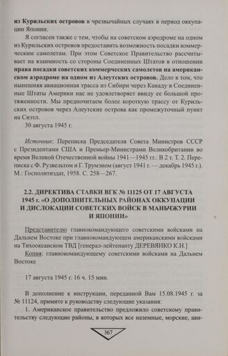 Директива Ставки ВГК № 11125 от 17 августа 1945 г. «О дополнительных районах оккупации и дислокации советских войск в Маньчжурии и Японии» // ЦАМО. Ф. 148а. Оп. 3763. Д. 213. Л. 167, 168. Подлинник. Русский архив: Великая Отечественная. Ставка ВКГ: Документы и материалы 1944-1945. Т. 16 (5-4). М.: ТЕРРА, 1999. С. 251-252.