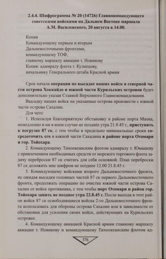 Шифрограмма № 20 (14726) Главнокомандующего советскими войсками на Дальнем Востоке маршала А.М. Василевского, 20 августа в 14.00 // ЦАМО РФ. Ф. 66. Оп. 178499. Д. 9. Лл. 34-37. МО ЦВМА. Ф. 129. Д. 17752. Л. 149-150.