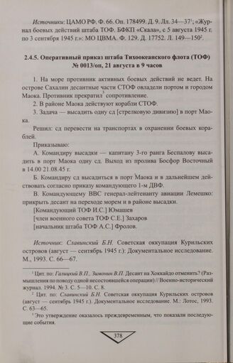 Оперативный приказ штаба Тихоокеанского флота (ТОФ) № 0013/оп, 21 августа в 9 часов // Словинский Б.Н. Советская оккупация Курильских островов (август-сентябрь 1945 г.): Документальное исследование. М., 1993. С. 66-67.